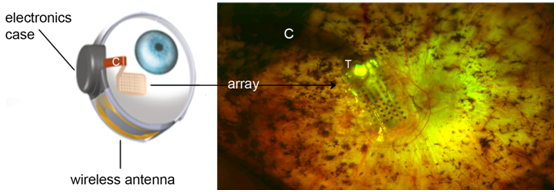 Figure 2 Internal (implanted) components of the Argus II retinal prosthesis. Left: Illustration shows orientation of implanted components around the eye, including the electronics case and wireless antenna receiving coil secured similar to a scleral buckle and the cable (C) that terminates at a 60-electrode array secured via retinal tack (Image courtesy of Second Sight Medical Products, Inc.). Right: Scanning laser ophthalmoscope image shows the 60-electrode array fastened by retinal tack (T) to its correct position over the macula. The glasses hold a miniature video camera in the nasal bridge that transmits images to the VPU, which in turn converts the images into data that can be sent to the internal electronics package. This data stimulates the electrode array to emit small electrical pulses that excite remaining viable inner retina cells, including ganglion cells. These artificially stimulated retinal ganglion cells then transmit signals through their axons to the lateral geniculate nucleus and on to occipital cortex, which perceives light patterns. Finally, patients then piece together these light patterns to create vision.