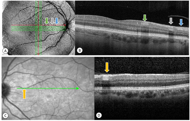 Figure 1 Retinal optical coherence tomography from two normal individuals. (A) Horizontal red line on panel. (B) Correspond to the retinal location of cross-sectional scan. (C) Was taken along horizontal green line. (D) The cross section. (A&C) Similar colored pairs of arrows indicate the same vessel on reference images. (B&D) And hyperreflective band with posterior shadows on cross sections. Multiple subtle hyperreflective dots at ganglion cell layers are small vessels.