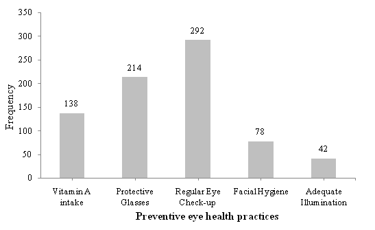 Finally, the most recommended eye health practice by respondents was “regular eye checkup by a professional” (84.39%) whilst the least advocated practice was “adequate room illumination for reading” (12.14%). Further findings are shown in Figure 2.