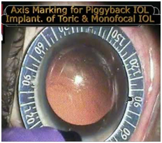 Fifty year old male patient presented to us with complains of poor vision without glasses. His refraction was +8 D Sph/+1.75 D Cyl at 20 degree; addition plus 2.50 (Right eye). Patient was interested for freedom from near and distance glasses. Preoperative keratometry revealed 1.25 Diopter of corneal astigmatism. IOL power calculation for right eye was plus 34.50 Diopter. During the time of surgery, multifocal and toric IOL were available only till 30 Diopters. We planned for primary piggyback IOL implantation of mutifocal IOL (15.0 D, Acridiff- Care Group, India) and toric (Acrioltoric 19.50 Diopter, Care Group, India). The reference marking was done in sitting position on slit lamp and axis marking was performed in the operating room. (Figure 1) Side-port incision was made and this is followed by injection of OVD (Alcon Viscoat) in the anterior chamber to coat the corneal endothelium. Main incision was created at steep axis (20 degree). This was followed by well centered 5 mm anterior capsulorhexis that is crucial for perfect centration of toric and multifocal IOLs. Cortico-cleaving hydro-dissection was performed and phaco-aspiration was done using low phaco power and fluidics parameters. This was followed by bimanual irrigation and aspiration of cortical matter.