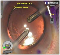 Step II: Implantation of Multifocal IOL: We then implanted multifocal IOL (15.0 Diopter Acridiff multifocal IOL- Care Group India) in the capsular bag. Standard practice is to implant one IOL in the capsular bag and another IOL in the ciliary sulcus, however, in this case we implanted both IOLs (Acrioltoric and Acridiff multifocal IOL) in the capsular bag as precise centration and position in the capsular bag is must for refractive outcome. OVD was removed between the IOL and from the anterior chamber using bimanual irrigation and aspiration. (Figure 2) We performed YAG Laser assisted enlargement of anterior capsulorhexis opening was done after 8 weeks time to prevent occurrence of interlenticular opacification. Postoperative visual outcome was 6/6 and N5 (unaided) and the patient was very satisfied with the visual outcome.