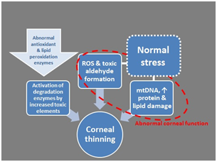 Also, corneas in keratoconus experience reduction in aldehyde dehydrogenase Class 3 and superoxide dismutase enzymes that have leading role in the reactive oxygen processes. This reduction results in oxidative damage due to reactive oxygen accumulation causing cytotoxic deposition of malondialdehyde and peroxynitrites and tissue damage (Figure 2). The increasing level of proteases and other catabolic enzymes as well with decreased levels of proteinase inhibitors such as α2-macroglobulin and α1-antiprotease is accused of participating in stromal regression.5