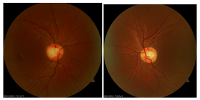 Figure 2 Disc photos of right eye and left eye: Arrows showing thinning of neuroretinal rim in both eyes respectively.