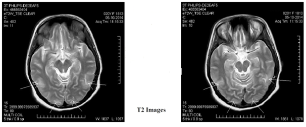 A 20year old female patient presented to the emergency department with history of bilateral loss of vision since three days. She complained of painless non progressive complete loss of vision, which was sudden in onset in both the eyes immediately after undergoing lower segment caesarian section under spinal anesthesia for pre-eclampsia in another center. There was no history of nausea, vomiting or convulsions. On examination, her visual acuity was perception of light with inaccurate projection of rays bilaterally. Pupils were 3mm in size, normally reactive and afferent papillary defect was absent. Anterior segment examination was unremarkable. No abnormality was detected on fundus examination. Her neurological examination was also within normal limits. Magnetic Resonance Imaging (MRI) T2 and Fluid-Attenuated Inversion Recovery (FLAIR) sequences showed bilateral hyper-intensities primarily located in the cortex and adjacent sub-cortex of occipital and temporal lobes (Figure 1) (Figure 2). Blood pressure was 142/96mmHg on presentation. Other systemic findings including central nervous system examination was within normal limits.