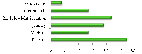 In this study Educational level of Transgender shown in Figures 3&4 was very low for most of the participants. As 20 (27.4%) Transgender were illiterate, 10 (13.7%) had once studied under madrasa, 14 (19.2%) managed up to primary, 16 (21.9%) were matric pass and 10 (13.7%) after great struggle did intermediate and only 3 (4.1%) persuaded graduation.