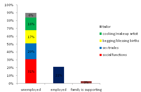 Most participants in the study 56 (76%) were unemployed and their source of income are shown in the figure below and among them, only 3 (4.1%) had family support and only a small number 16 (21%) were employed. They had very low socioeconomic status shown in Table 3.