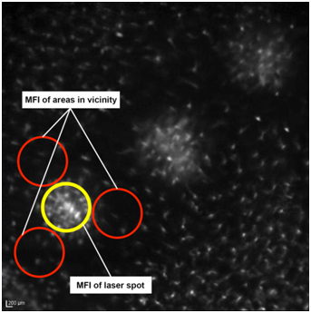 The intensity ratio was calculated as ratio between the MFI of the laser spot and the average MFI of the area in the vicinity of the laser spot: