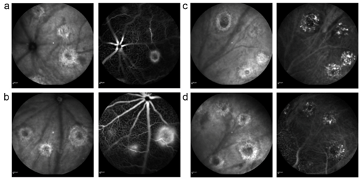 Figure 2 Different CNV lesion types on FA. Infrared images (left) and corresponding fluorescein (a,b) and ICG (c,d) angiograms (right) of a mouse fundus recorded 14 days after laser treatment. Early-phase angiography is shown in the upper row, late-phase angiography in the lower row (a). Two grade 0 lesions (upper image) and one grade 1 lesion (lower image) (b). Two grade 1 lesions and (right) one grade 2 lesions on fluorescein angiography.7