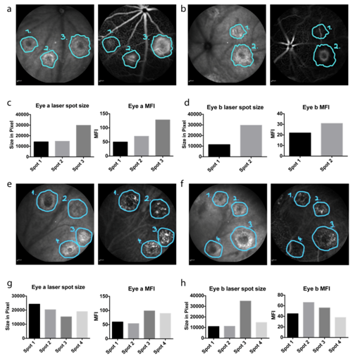 Figure 3 Placement of circles on in vivo FA images (a,b). Infrared images with corresponding fluorescein angiograms, in which the laser lesions have been surrounded in the infrared images and the labels have been transferred to the angiograms using the software Photoshop (c,d). Comparison of laser spot size and MFI (e,f). Infrared images with corresponding ICG angiograms, in which the laser lesions have been outlined in the infrared images and the labels have been transferred to the angiograms using Photoshop (g,h). Comparison of laser spot size and MFI.
