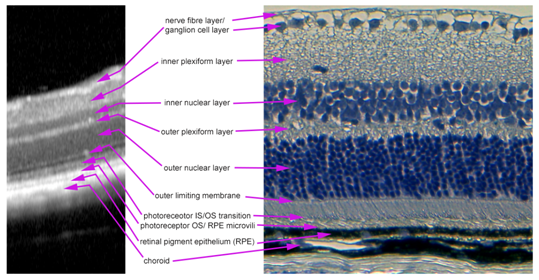Figure 4 Layer segmentation in an in vivo OCT image. OCT image (left) and H&E stained paraffin section (right) of an intact mouse retina. All layers of the retina that can be seen in the paraffin section are also visible and clearly definable in an OCT image.