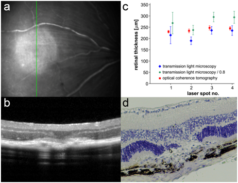Figure 5 Quantification comparison between histology and OCT (a). Infrared image of a laser spot in a mouse retina 3 days after laser treatment. The green line indicates the scan direction of the OCT image in (b). (b) OCT of a laser spot in a mouse retina 3 days after laser treatment (c). Results of retinal measurements made with the software Heidelberg Eye Explorer on OCT and with Photoshop on the paraffin section for examples of laser spots (1 to 4) with and without consideration of loss of thickness during embedding (d). H&E-stained image of the laser spot shown in (b).