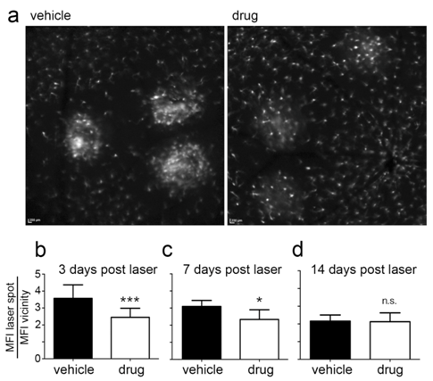 Figure 6 Determination of intensity ratios in in vivo AF images. Comparison of AF images obtained in a vehicle-treated and drug-treated mouse fundus 3 days after laser treatment (a). Results of AF intensity ratio determination are shown for the time points 3 days (b), 7 days (c) and 14 days (d) after laser treatment.