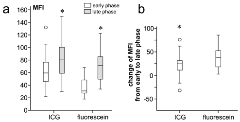 The lesion size and its mean brightness, represented by the MFI, were measured. Laser spots over large vessels were excluded from the analysis to avoid artificial increase of the MFI due to strong brightness of the vessels (Figure 3). We determined the distribution of MFI values in at least eight eyes in each experimental group (either fluorescein or ICG dye, 30 laser spots per eye) and compared the findings. A detailed presentation of the analysed mice and laser spots can be found in Table S2 (supplementary data).