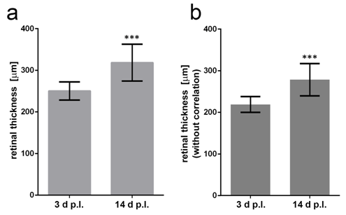 Jiao et al.17 have shown that retinal thickness in histopathological paraffin sections decreases to about 80% of that in vivo (as can be determined in an OCT image), while choroidal thickness decreases to 50% of that in the normal structures, owing to paraffin embedding. For correlation, we were strictly measuring the intact retina from the nerve fibre layer to the beginning of Bruch’s membrane. To approximately compensate for the shrinking during histology procedures, the results of retinal thickness measurements in samples of histological sections were divided by 0.8: