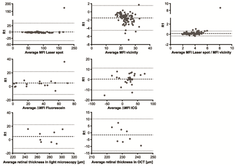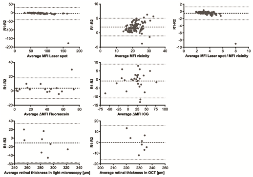 Table 2 Mean differences and 95% CIs for interobserver agreements (R1-R2) and intraobserver agreements (R1) for AF ratio (MFI laser/MFI periphery), ΔMFI in FA with fluorescein and ICG, and retinal thickness in OCT and light microscopy. R1,reader 1; R2, reader 2