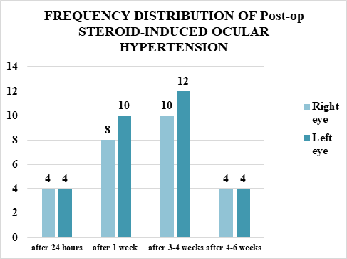 Description graph 1: Frequency based distribution of Post-op steroid-induced ocular hypertension shows that Post-op steroid-induced ocular hypertension was found 4%, 8%, 10%, and 4% at 24 hours, 1 week, 3-4 weeks and 4-6 weeks in right eye respectively. Post-op steroid-induced ocular hypertension was found 4%, 10%, 12%, and 4% in left eye respectively.