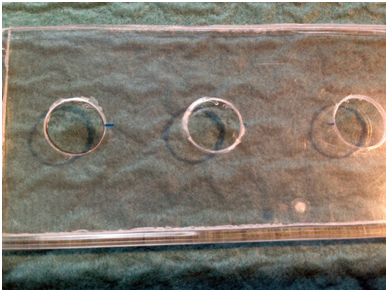 Four samples of 3 different CTR manufacturers with an open state diameter of 13.0 millimetres were evaluated for deformation when exposed to a constant compression at body temperature. Capsular tension rings are usually described by an open state diameter and a closed state diameter.10 The closed state diameter is the size of the capsular bag the CTR is intended for. All CTRs open state diameter were photographed and recorded under the microscope. The capsular tension rings were placed in separate containers with a diameter of 11.0mm, simulating the capsular bag. These containers were Plexiglas, machine made moulds with flat edges and a depth of 1 mm. The containers had an open top for easy insertion and extraction of the CTR without over-bending or stretching the CTR. The CTRs and containers were submerged in BSS at body temperature (37 degrees Celsius.) (Figure 2).