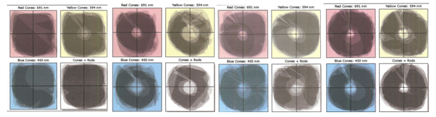 79-year old Caucasian male with bilateral AMD (OS worse than OD), extensive bilateral drusen, mild bilateral cataracts, and poor baseline contrast sensitivity function (Figure 4a) details impressive bilateral gradual resolution of his central scotoma; (Figure 4b) details restoration of central macular pigment peak; color vision also demonstrated improvement; finally, the subject noted modest gains in the subjective visual field questionnaire.