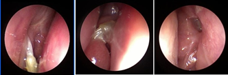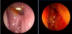 Figure 2 Nasal endoscopy, proving the good conditions of the middle meatus mucosa and of the ostium, before and after BIKA removal.