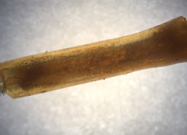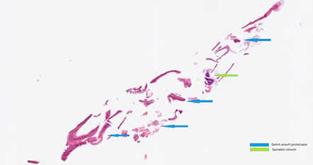 During the last follow up visit, regarding the anatomical results, no one showed signs of inflammatory reactions, lacrimal punctum enlargement or tractional dilatation and no one had tube displacement or the burrow of the intubation in the medial canthus. One patient shown a mild inferior lacrimal punctum hypertrophy (EX-DCR with BIKA implantation performed 7 years before) (Figure 1). All of the patients reported their symptoms were none and referred absence of discomfort during all of the follow up. The nasal endoscopy, performed by the same otolaryngologist of our Department, shown in all of the patients good conditions of the middle meatus mucosa and of the ostium (Figure 2, Figure 3).As regard the histocytological study, we submitted the intubation material to the Anatomic Pathology of our Department. In one case, mucous matter was found at the entrance of the puncta (Figure 4). In another case, whitish material was found inside of the intubation. The anatomic pathologist argued that the material could be entered by retrograde obliteration or by fissuration of the tube wall and micro infiltration consequently. The whitish substance was made of amorphous protein material, sporadic leukocytes and histiocytes. The lumen of the intubation was partially obliterated (70% of the lumen) (Figure 5 and 6).