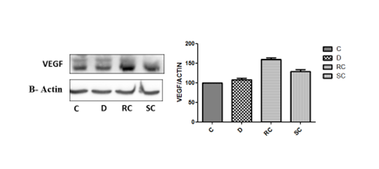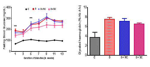 Glycated haemoglobin (HbA1c) was a better indicator than fasting blood glucose levels of the glycemic status in diabetics. A significant increase in HbA1c levels were observed in diabetic animals (>6.5 %). Treatment with SC was found to decrease the HbA1c percentage moderately but it was not statistically significant (Figure 1D). These results were found to be in correlation with fasting blood glucose pattern between groups. No significant changes were observed with RC.