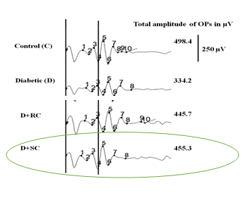 Electroretinograph: In diabetic rats (D) amplitude of OPs were reduced (334.2µV) compared to normal control (C) animals. Ingestion of curcumin resulted in lowering the reduction in OP amplitudes suggested by sum of Ops compared with RC (445.7) and SC (455.3). SC further improved the implicit times (Figure 2).