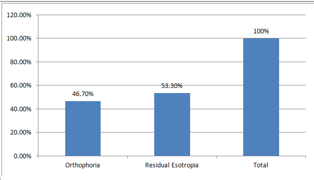Out of 30 refractive accommodative esotropic patients there were 46.7 % (n=14) patients were orthophoric and 53.3% (n=16) patients were with residual esotropia (Figure 1).