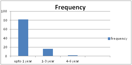 Figure 2 It shows the different categories of duration of using spectacles/contact lens. Out of 100 patients, 82% were using up to 1 year, 16% were using 1-3 years and 2% using from 4-6 years.