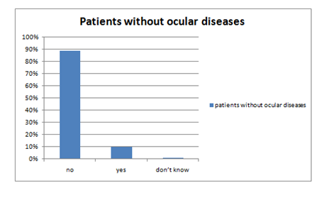 Figure 3 shows the hyperopic patient with any ocular disease history. Out of 100 patients, 89% were in category of no, 10% in yes and 1% in don’t know.