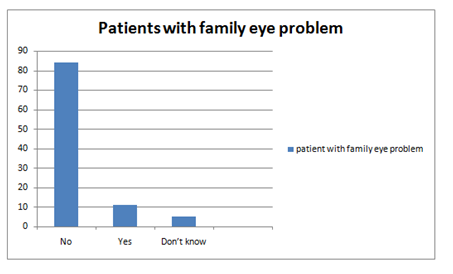 The study shows familial pattern in hyperopic patients. Only 2% has positive father history of hyperopia, 9 percent has positive mother history of hyperopia, 11% has positive brother history of hyperopia and 8% has positive sister history of hyperopia so the siblings has maximum importance positive family history and that is only 19% so it is not as much high as compared to other refractive errors. According to our study that was done about the correlation between refractive errors and siblings of the patient demonstrate that it is only on the chance base that is great correlation would present. As a twin research was done Thomas’s hospital. In this environment and genes were studied by taking different errors of refractions and as a result it was found that genetic factor are major factor in the absence or presence of hyperopia and myopia and in case of astigmatism it is seems to be dominantly inherited.12 In This study 89% have no ocular disease history 10% have positive ocular history and 1% don’t know out of 100 patients.