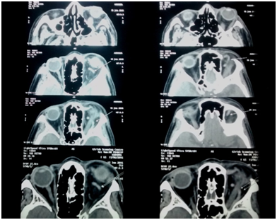 A CT/MR angiography was also ordered to look for the possibility of a low flow carotico-cavernous fistula, but the patient refused the procedure. A provisional diagnosis of idiopathic orbital inflammation with SOV occlusion was made. The patient was given a trial of oral prednisolone 1mg/KGB for 72 hours but there was no response to the steroid therapy nor was there an alleviation of symptoms. In view of the multiple vaso-occlusive sites - intraocular, intraorbital and intracranial, a referral to the physician and neurologist for a complete haematological work up and initiation of anticoagulant measures was made. The patient was transferred to the neurology department for management of the intracranial vascular occlusion and was thereafter lost to follow up.