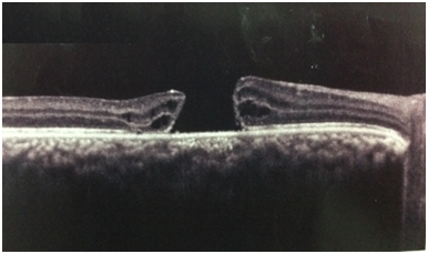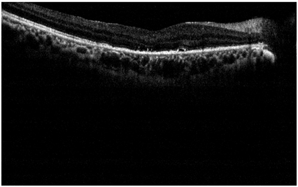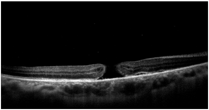 Optical coherence tomography (OCT) was performed to confirm the macular hole seen at the fundus examination (Figure 1). The patient was surgically treated with posterior pars plana vitrectomy and peeling of the internal limiting membrane with the aid of the Brilliant Blue dye, followed by tamponade with SF6 gas. It progressed satisfactorily after surgery, with improvement of visual acuity and absence of macular hole at funduscopy. At OCT, it presented macula compatible with post-surgical reorganization, with no evidence of a macular hole. About 1year after the procedure, the patient presented visual acuity of 20/80 with the best correction in OD and no evidence of macular hole to the OCT (Figure 2).