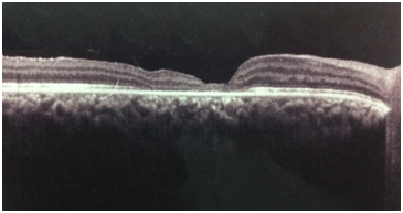 He underwent phacoemulsification of the lens with intraocular lens implantation in the capsular bag, followed by posterior pars plana vitrectomy and peeling of the inner limiting membrane with the aid of brilliant blue dye and SF6 gas. On the 12th postoperative day the macular hole was closed, seen at funduscopy (Figure 5) and confirmed in the OCT exam (Figure 6). The visual acuity with the best correction on that day was of count finger at 3meters, without the presence of the central scotoma previously mentioned.