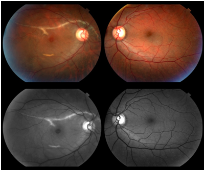 Figure 3 Preoperative fundus photography (color and red-free). Notice the macula hole and a choroidal rupture in the right eye.