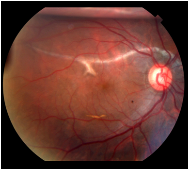 A 43-year-old male patient with a history of trauma with fireworks in the OD 8 months ago, with LVA and "dark spot in vision" since then. Denies previous ophthalmological comorbidities. At ophthalmologic examination: visual acuity of 20/200 in OD and 20/20 in OS. Biomicroscopy showing posterior subcapsular cataract in OD and without abnormalities in OS. 10 and 14mmHg aplanation tonometry in OD and OS, respectively. Funduscopy presented with macular hole and choroidal rupture in OD and without abnormality in OS (Figure 3). OCT examination of the macular region of the patient right eye (Figure 4) confirmed the fundoscopic finding.