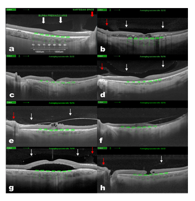 Figure 1 Choroidal thickness measurement in normal (A) Diabetic Retinopathy, (B) AMD, (C) myopic, (D) VMA and/or VTM, (E) RP, (F) CSR, (G) and miscellaneous, (H) patients. Swept-Source Deep Range Imaging Optical Coherence Tomography (SS-OCT) 5-lineCross raster scan demonstrating measurement technique used to obtain choroidal thickness across the macula. This OCT also demonstrates the presence of Bursa Premacularis (white arrows) and Martegiani space (red arrows).