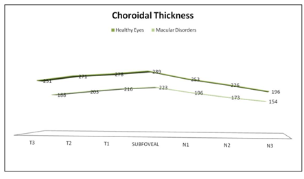 Figure 2 Graph showing the differences in macular choroidal thickness in healthy eyes group and macular disorders group. Mean thickness at each of the 7 locations measured at 500µm intervals temporal (T) and nasal (N) to the subfoveal area. The thickest choroid in healthy eyes group (top) and in the macular disorders group (bottom) was in foveal area and the thinnest in both groups was nasal (N3) area.