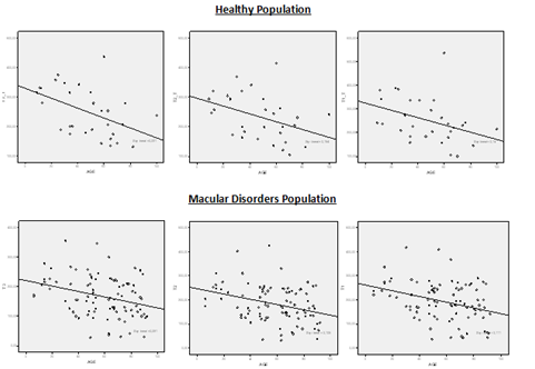 Figure 3 Scatter plot showing choroidal thickness at T3, T2 and T1 in the Healthy population and Macular disorders population. Choroidal thickness and age correlate significantly: (T3 (r=-0.475, p=0.009); T2 (r=-0.393, p=0.03); T1(r=-0.375, p=0.04) and T3 (r=-0.333, p=0.001); T2 (r=-0.323, p=0.002); T1(r=-0.302, p=0.004); respectively).