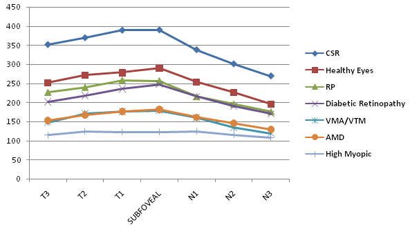 Figure 4 Graph showing the differences in macular choroidal thickness among healthy eyes group and different macular disorders groups. The thickest choroid in healthy eyes, CSR, Diabetic Retinopathy and VMA and/or VTM groups was in foveal area. The thickest choroid in RP, AMD and High Myopia eyes groups was in temporal 1 and foveal areas.