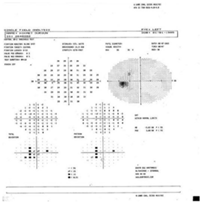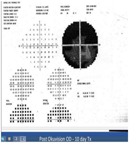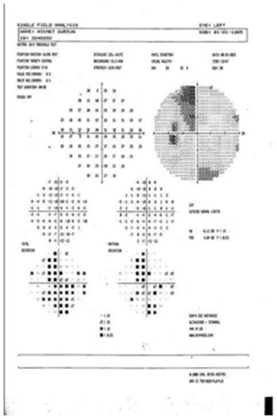 In 4 patients with NA-AION, visual acuity improvement more than 3 Snellenlines was observed. In 10 patients, improvement in visual acuity was between 1 and 3 Snellenlines. 6 patients were stable, but reported increase in brightness and color sensations. Ischihara color plate examination revealed more than 2 plates improvement in 3 of these patients. VF examination demonstrated improvement in 10 patients (Figure 2). In TON group, visual acuity improvement more than 3 Snellenlines was achieved in 3 patients. In 4 patients improvement was between 1 and 3 lines. In the other 3 patients, no change was observed. VF expansion more than 10 degrees was detected in 4 patients (Figure 3-6). In the RP group, visual acuity improved more than 3 Snellenlines in 3 patients and in 2 patients improvement was between 1 and 3 lines (Table 1). No adverse effects were recorded. As a whole, average improvement of VA by 2 lines was achieved. Improvement in VF was investigated by calculating the change in mean deviation (MD) before and after stimulations in all the groups. Average improvement in MD was statistically significant (P≤0.001).