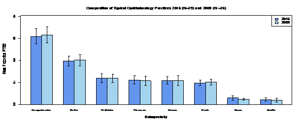 One notable difference between the typical practice of 2006 and the typical practice of 2016 is the increase in the average number of physicians per practice from 23 to 27. This change is consistent with a response to a growing demand for eye care. Some recent estimates suggest that "The demand for eye care is soaring at about five times the U.S. population growth..."2 due to the increase in the older patient cohort. Larger practices may not only benefit patients by providing a wider variety of services, and improved continuity of care, but may also potentially benefit physicians through cost efficiency from shared overhead and cross-referrals.33‒35 Despite the increase in the average number of physicians per practice, the allocation of FTEE in the typical practice from the 2009 study was retained suggesting the feasibility of this distribution as a rough guide for staffing.