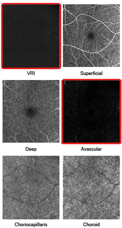 Optical coherence tomography angiography (OCTA) is a very useful angiography type for the evaluation of both retinal and choroidal vasculature. OCTA is noninvasive imaging method without adverse effects because the usage of a contrast agent is not needed in this imaging method. Using by OCTA, the vasculature and blood flow of retina and choroid can be visualized in detail through detecting motion contrast of erythrocytes in the vessel, using serial optical coherence tomography B-scans. OCTA has an ability to perform the separate segmentations including the vitreoretinal interface (VRI), the superficial retinal layer, the deep retinal layer, avascular outer retina (AOR), the choriocapillaris and the choroid (Figure 1).1‒8 In a healthy eye, the VRI has no vascular structure though the ganglion cell layer of the retina has the superficial retinal capillary plexus based on vitreo-retinal histology and VRI segmentation of OCTA (Figure 1) VRI.1‒8 Preretinal neovascularization (PNV) is characterized by networks of vessels lying on the surface of the retina and invading the cortical vitreous gel and extending into the vitreous cavity. PNV usually occurs in the ischemic retinal vascular diseases such as proliferative diabetic retinopathy, retinal vein occlusion, retinopathy of prematurity and sickle-cell disease retinopathy.9‒13 PNV in earlier stages of the pathogenesis of abnormal neovascularization event may be overlooked. VRI segmentation of OCTA can be used to screen and detect the early or subclinical PNV in these diseases.9‒12 In the other hand, both the histological examinations and OCTA reports of retina in healthy subjects demonstrated that there is an avascular retinal region (avascular outer retina, AOR) in the deep or outer layer of the retina. AOR is the layer between the outer plexiform layer (OPL) in the inner border and ellipsoid zone in the outer border. The outer retina segmentation between the OPL and Bruch membrane by OCTA show no vascular blood flow in a normal eye (Figure 1) Avascular.1‒8 Choroidal neovascularization (CNV) defines the development of the new blood vessels derived the choroid and the invasion into sub-retinal pigment epithelium (RPE) or subretinal space via a break in Bruch membrane. Type 1 choroidal neovascularization (CNV) is characterized by vessels proliferating under the RPE and it is found in the subretinal space. Type 1 CNV is also termed occult CNV because it can be poorly detected with dye-assisted angiography. In the OCT scans Type 1 CNV is observed as localized fusiform serous or fibro-vascular RPE detachment. Additionally, polypoidal choroidal vasculopathy is also considered as a variation of this type CNV.14,15 In newly studies, it has been reported that OCTA provides more precisely and comprehensively describe of Type 1 CNV in AMD [16-19]. Thus, OCTA can also be used for early detection of an occult CNV (Type 1 CNV) in this AOR in the eyes with asymptomatic eyes in the stages of early or intermediate AMD.