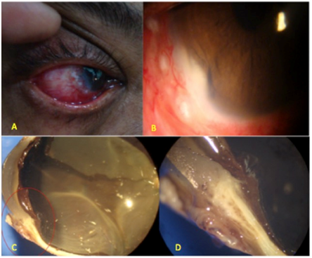 Figure 1 Torch light (A) & Slit lamp examination B showed a white coloured mass in temporal irido-corneal angle which was pre-occluding the iris along with surface changes. Gross visualization (C & D) after En-block enucleation.