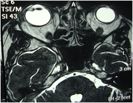 MRI Figure 3 showed an enhancing lesion measuring 5x4mm inside ciliary body on lateral aspect with associated preseptal soft tissue swelling. Systemic evaluation for HIV, HPV and Hepatitis came out to be clean.