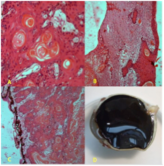 On basis of clinical appearance, UBM and MRI findings diagnoses of Squamous Cell Carcinoma with intraocular and lacrimal tissue spread were made. En-block enucleation with Mitomycin C application (Figure 4C) (Figure 4D) along with lacrimal tissue resection and cryotherapy to vortex veins was done and ball implant was placed. Margins of conjunctiva were resected till it was free of altered cells on frozen section. Histology of enucleated eye Figure 4D showed keratin pearls (Figure 4A) along with atypical undifferentiated cells (Figure 4B) (Figure 4C) and confirmed it to be Squamous Cell Carcinoma of Grade-II involving Conjunctiva, Limbus, Anterior Chamber, Ciliary Body and Retina (With localized exudative RD) with no involvement of Lacrimal Gland.
