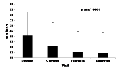 Sixty-seven patients were enrolled that met inclusion criteria and 134 eyes were included in our analysis. Of these 84.1% were female, and a similar percentage were Caucasian. The mean age of participants was 55.4 years (±15.1, range 21-79 years). Twenty percent of the patients were contact lens wearers and two-thirds of the females were post-menopausal. These analyses included participants who had four or more of the dry eye criteria referenced in the methods (n=47). The means for each variable are presented by visit and eye (Figures 1−8), p-values indicate the effect of visit (time)). OSDI at the first visit was 41.0±22.0 (Figure 1). The score decreased over each visit (p-value from mixed model, p<0.0001), and was 24.4±19.2 at the eight-week visit. This represented a 38% decrease in OSDI over two months (Table 2). A significant decrease was seen as early as the one-week visit in OSDI as well (p-value<0.0001).