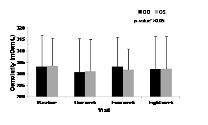 The primary analysis evaluates changes from baseline in osmolarity and other diagnostic signed for dry eye. Basic means and standard deviations were computed by visit for the variables of interest. Frequency was used for any categorical data. Due to the potential for inter-eye variability given a dry eye diagnosis, the decision was made not to average the eyes together, but assess each separately. In order to assess whether there variables differed across visit, a mixed model analysis was done. This analysis accounts for the repeated visits across person, taking into account the correlated nature of the visits. The ability for the model to adjust for correlations within a patient also allowed for the inclusion of both eyes in the model, as well. If there was a significant effect of time (visit), Tukey’s post-hoc analyses were used in order to determine which visits were significantly different from each other. Percent change from the baseline visit was calculated for each visit as well, to control for the magnitude at baseline and attempt to present a standardized picture. Patients used in these analyses were selected to meet at least four of the seven diagnostic criteria for dry eye in order to have a pool of patients likely to have dry eye.