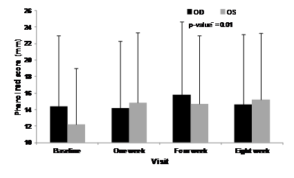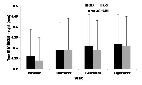 Phenol red did not demonstrate a statistically significant difference between eyes, (p=0.22) but the mean phenol red values did differ across time (Figure 4, p<0.05). Post-hoc testing indicated that the difference between baseline and four weeks was statistically significant. The difference at eight weeks was not statistically significant (p=0.06). Table 2 shows that the percent change from baseline across the two eyes, with more change occurring in the left eye. There was a significant difference between the eyes for tear meniscus height that was controlled for in the analysis (p=0.04). Meniscus height showed a statistically significant increase across visits (p=0.004), from 0.25 mm to 0.32 mm (Figure 5). Post-hoc testing indicated that the four-week visit and the eight-week visit were statistically significantly different than baseline. A large proportion of the percent increase happened by one week (Table 2, between 25 and 38%). By week eight there was roughly 38 and 55% increase from the initial visit.