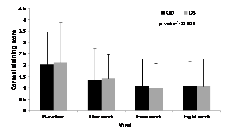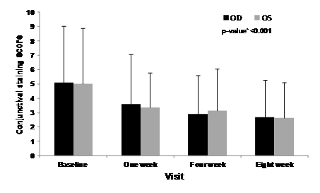 The following procedures were performed and information recorded at the Baseline/Screening Visit and at all follow-up visits. Patients were examined for eligibility at the baseline examination following informed consent. Patient’s demographics and medical history were recorded. The following examination procedures were performed for both eyes at all visits. Slit-lamp examination included assessments of corneal edema, bulbar conjunctival injection, cornea staining, chemosis, inflammatory cell, and flare. The ocular surface was examined by assessing the entire bulbar conjunctiva. The patient’s eyes were evaluated under the slit-lamp biomicroscope using a cobalt blue filter transmitting 330 to 400 nm and a beam approximately 4 mm wide and l0 mm high. Corneal staining was observed in the central, inferior, nasal, temporal and superior regions on a scale of 0 to 3 based on the Report of the National Eye Institute/Industry Workshop on Clinical Trials in Dry Eye. A total grade of greater than 3 out of 15 for the five corneal regions is considered significant for dry eye staining. Conjunctival staining was observed in the six regions on a scale of 0 to 3 based on the Report of the National Eye Institute/Industry Workshop on Clinical Trials in Dry Eye. Using this method, a total grade of greater than 3 out of 18 for the six conjunctival regions was considered significant for dry eye staining (Table 1).