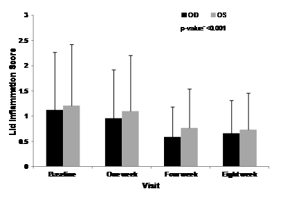 Corneal and conjunctival staining had similar results (Figures 6 & 7). The two eyes were similar for both kinds of staining (p>0.05), and there was a statistically significant difference between staining across the visits (p<0.001), with the initial values higher than each of the subsequent visits. The corneal staining score began at just over 2.0 at the first visit and decreased to about 1.0 by the eight-week visit. There were negative percent changes from baseline at all visits, starting with a decrease of about 26% by one week and ending up with a percent decrease of about 33% (Table 2). Conjunctival staining was about 5.0 at the first visit and dropped to 2.6 at the eight week visit. Percent decrease from baseline to week one was between 5 and 10%. There was a 50% decrease in conjunctival staining by eight weeks. Lid inflammation scores were statistically significantly different between eyes (p=0.001), remaining a little higher in the left eye than the right eye. There was also a significant difference across visits in the lid inflammation score (p<0.001). Scores were about 1.2 at baseline and decreased to 0.7 by the eight-week visit (Figure 8). At the one-week visit, there was no statistically significant decrease from baseline (p>0.05), but it was seen at the four- and eight-week visit (p<0.0001). By week eight, the percent decrease from baseline was about 40% (Table 2).